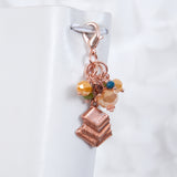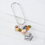 Designed to coordinate with the November "Home Sweet Home" planner kit, this is available in rose gold or silver finishes and as either a wide paper clip dangle or lobster clasp charm. The dangle is decorated with clusters of brown, golden yellow, olive green and blue crystals and features a stacked books charm.